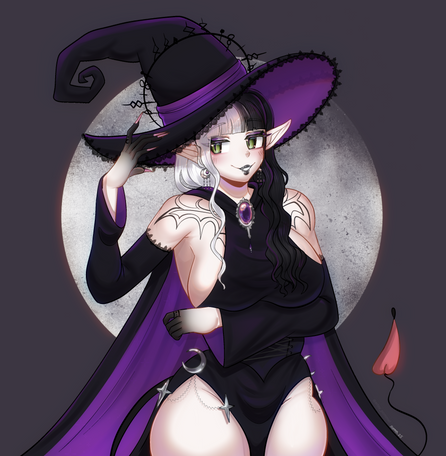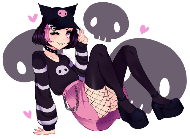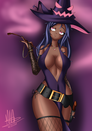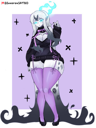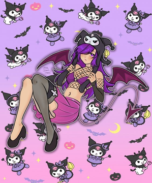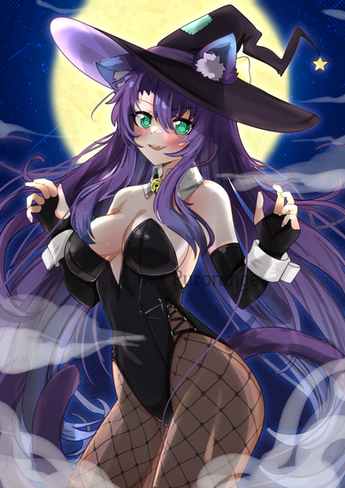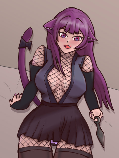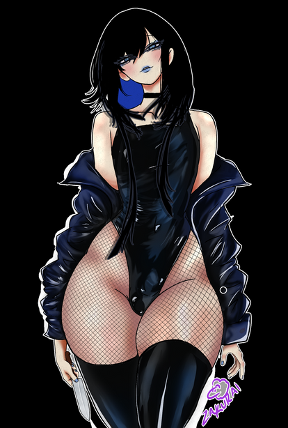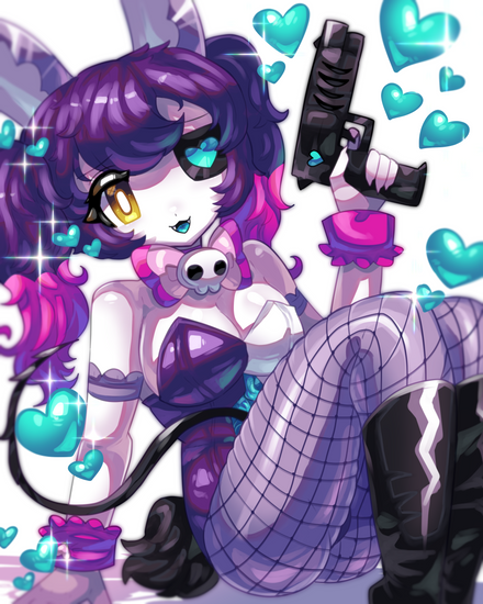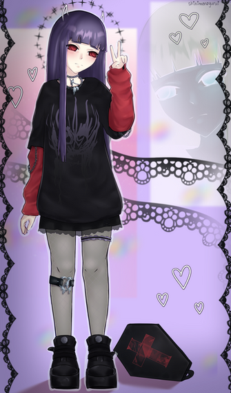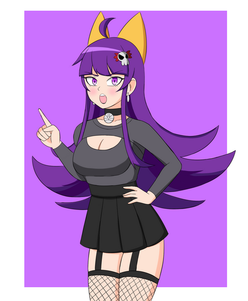 #digitalart #animegirl #fanart #gothic #anime #blush #fishnets #goth #haruka #mobilegame #purplehair #shotgun #shy #thighs #widebrimmedhat #kuromi #mobage #bluearchive #igusaharuka