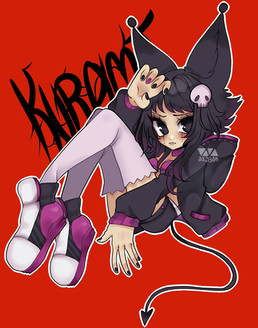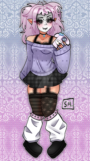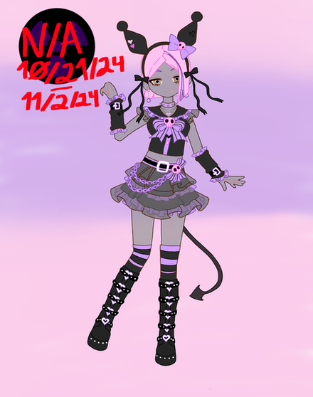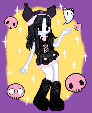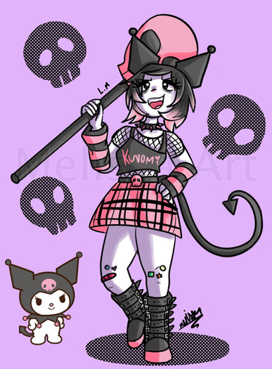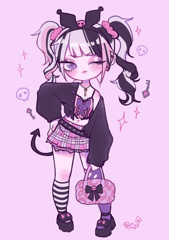 #originalcharacter #digitalart #ribbon #blush #boots #ears #fishnets #glasses #meganekko #oc #platforms #sanrio #shy #skull #spikes #straps #tail #thighs #kuromi #rinavermilion