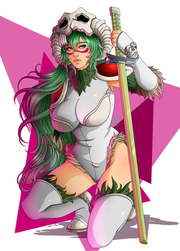 #fanart #anime #animegirl #digitalart #bleach #fur #greenhair #leotard #nell #scar #skull #sword #tan #pauldrons #nelliel_tu_odelschwanck