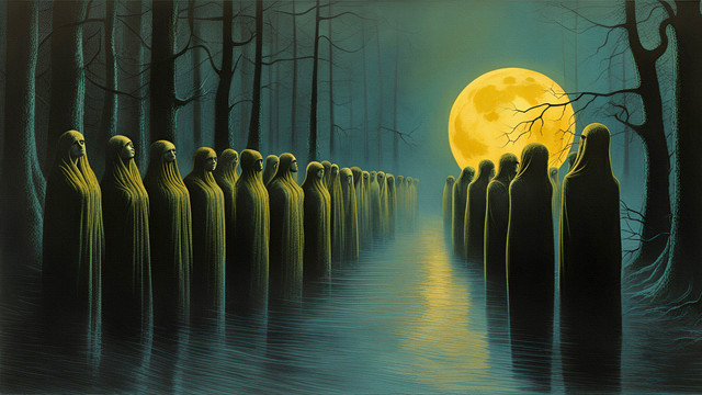 Under the moonlit night, the Iele emerge, manifesting as dancing Horas, their movements unfolding within hidden enclaves like glades, the crowns of specific trees such as maples and walnut trees, as well as by ponds, riverbanks, crossroads, and abandoned fireplaces. Clad in scant attire, their disheveled hair obscures their breasts, while bells adorn their ankles and candles illuminate their path. During these enchanting rituals, the Iele often appear ethereal, but on rare occasions, they don chain mail coats. The effect of their mesmerizing dance, known as the Hora, evokes echoes of the ecstatic Bacchantes.