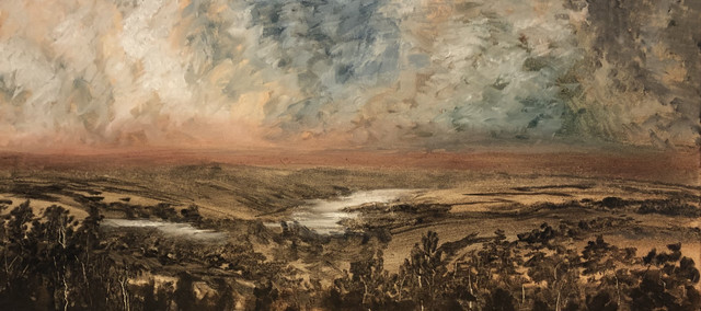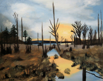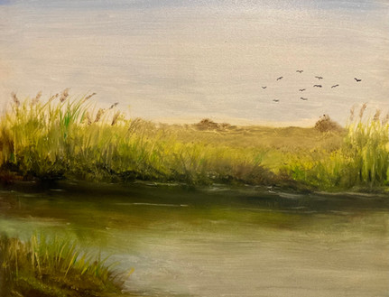 Seemingly calm and serene oil painting on canvas.The grasses in the foregroud are made by aggresively cutting through the paint with a pellete knife - symbolic of self harming.
