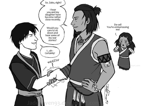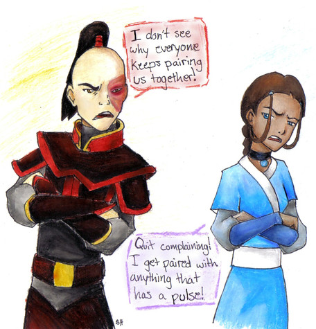 so the story was, feeding each other cake at a wedding; but of course, toph can't see = cake all over Sokka.(c) Avatar the Last Airbender- Sokka and Toph
