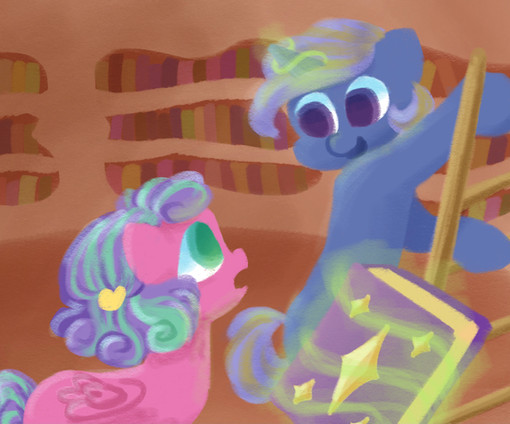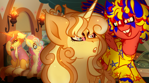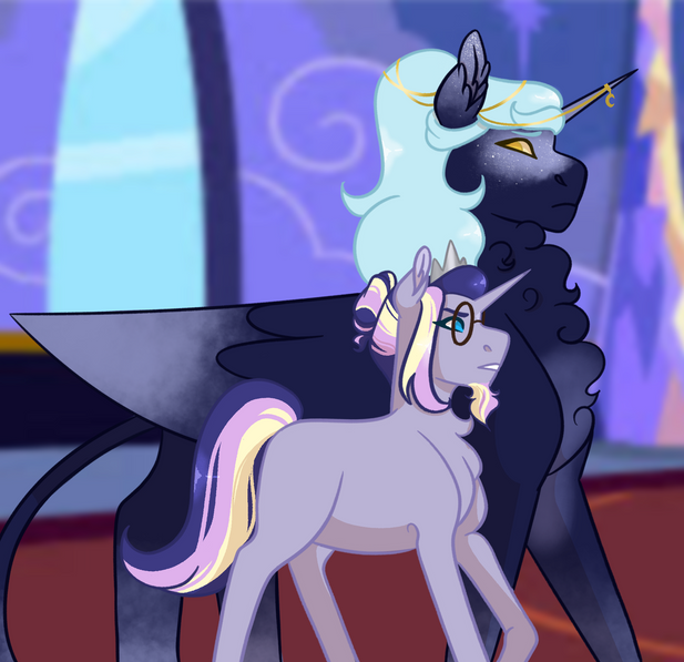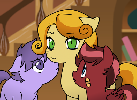At the front desk below there stood three creatures idly conversing among themselves. A hippogriff, a dragon, and a changeling. They seemed familiar from something, but she couldn't quite put her hoof on it. The double doors creaked open, attracting the attention of many in the room despite the idle chatter. Inside stepped... a unicorn, but if that wasn't enough, two more followed. They scanned the room for any left empty seats... how many pairs of hooves did they have? Four pairs of hooves... three heads.. it didn't add up... then they decided to pick the seats right next to her. Unfortunately, those were the only two empty seats left.