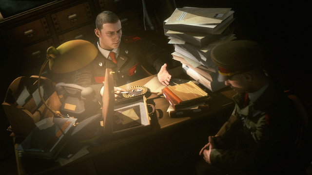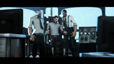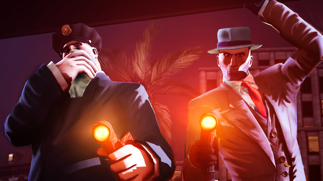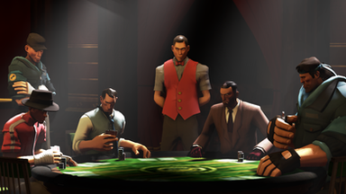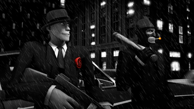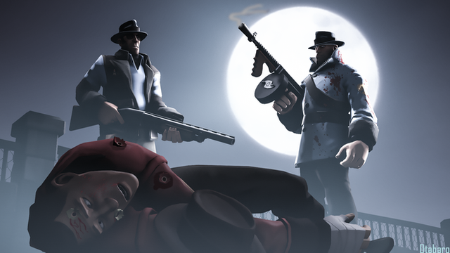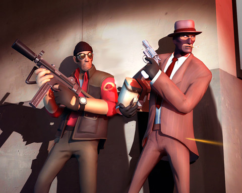Pixelated shadows at Spy's fedora and chair near Scout.