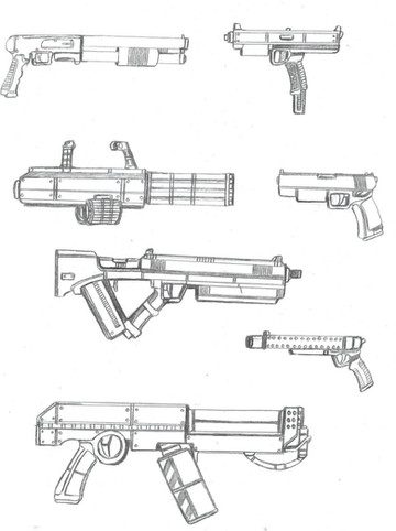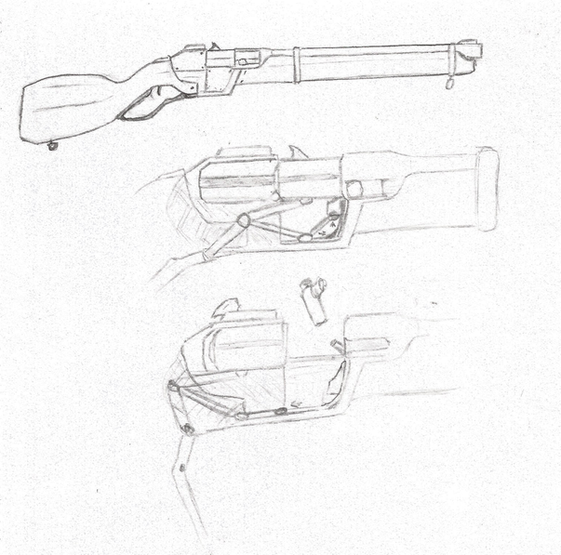 Here it is, the latest and greatest iteration of my favored hand cannon. I've been working on the design for years, some of my older watchers may remember a couple of my earlier attempts, but this is my favorite version so far. Double action only because of the internally housed hammer, or perhaps even semi-automatic (haven't decided yet). 6 o'clock configured as before. 6 shots of a cartridge I have dubbed ".42 custom" which is meant to be an intermediate rifle cartridge with a larger calibre projectile. It would be comparable to something like a .500 S&W magnum in terms of power, but with better velocity and penetration.This thing is meant to be a beast of a pistol, near 14 inch overall length, heavy metal frame. Also, it has an integrated gas-actuated counterbalance over top of the barrel which is intended to fling forward in the housing quickly to help mitigate muzzle flip and felt recoil, and paired with a series of gas vents to act as a compensator. It'd be something you could hunt dangerous game with, but you'd definitely want a proper muzzle break on there as well.