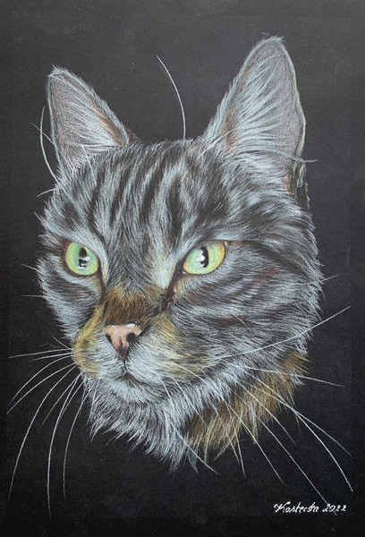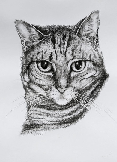 A cat in fineliners, white Polychromos pencil etc. Brown paper, size A4.