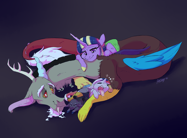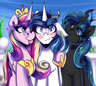"Shining Armor doesn't mind Cadance and Chrysalis being in a relationship. Really, he doesn't. What he does take offense to is them making sleep in his own bed impossible. Shining has to come to terms with what's happening as he questions if his wife still has feelings for him. And as he questions Chrysalis's feelings for him. And as he questions the maid's intentions. And as he questions his feelings for his 'daughter'. And as he contemplates either buying a bigger bed, or one of his own.