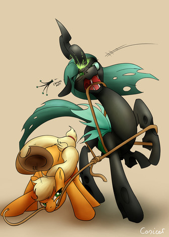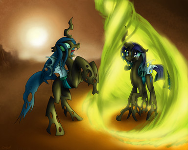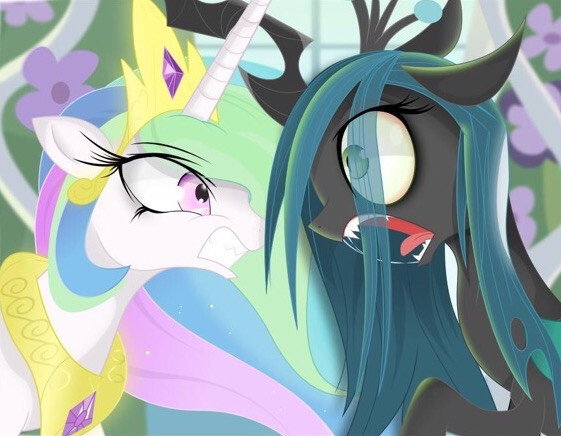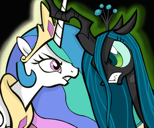 This is done as a cover for and upcoming story where Celestia gets her horn caught in one of Chrysalis's holes by Aera . I haven't read the story, but I can only guess it would be a buddy romantic comedy with the two matriarchs try to go about their daily business stuck together. And I just like drawing Celestia and Chrysalis.Related content