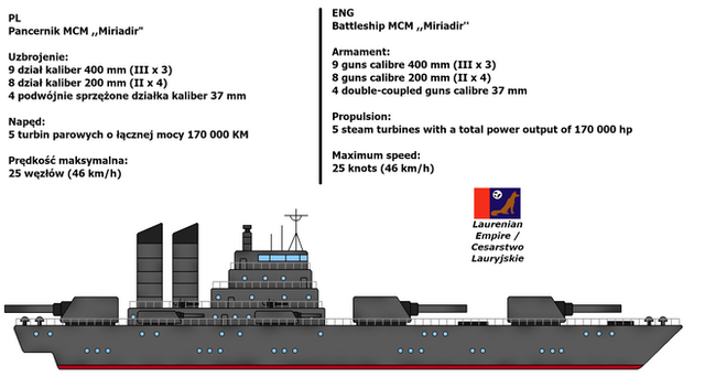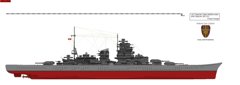 The divinity is the largest warship to ever grace the seas. This water-borne HQ is essentially a floating command centre and HQ able to direct entire fleets on its own. It's two runways allow for the launching of scout and support planes in order to gain advantages over an enemy. the ship was constructed with the idea to be the biggest, and so became the biggest. The ship uses an "all-or-nothing" armour scheme, meaning vital parts such as the hull are extremely well armoured while less important areas are left with little in the way of protection. So far it's biggest use has been with coastal bombardment, Outranging and destroying coastal facilities such that smaller ships may deploy troops or assist in bombardment.The ship and its stats were mainly based off of the IJN Yamato, which is around 318m long for comparison.