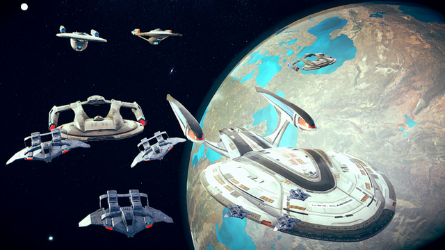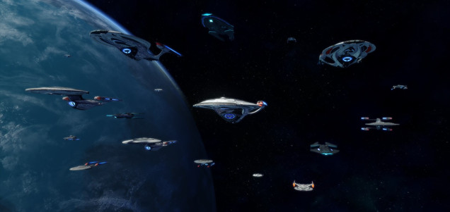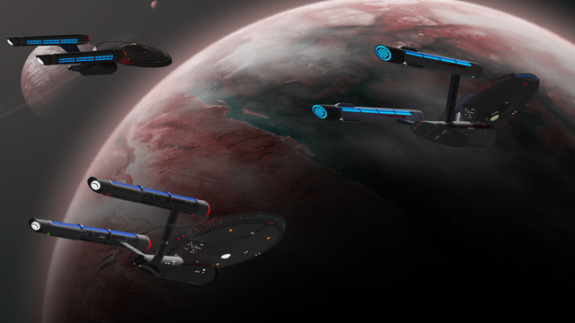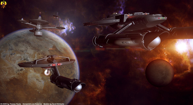 After an attack on Jupiter Station in early 2411, Starfleet assigned ships to defend the station. The task group was lead by the USS Canada (center) and USS Juno (left)Related content