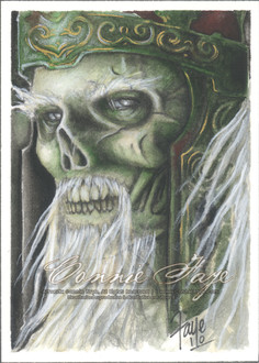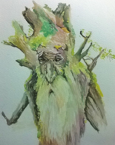 He led the way in under the huge branches of the trees. Old beyond guessing, they seemed. Great trailing beards of lichen hung from them, blowing and swaying in the breeze. Out of the shadows, the hobbits peeped, gazing back down the slope: little furtive figures that in the dim light looked like elf-children in the deeps of time peering out of the Wild Wood in wonder at their first Dawn. --JRR Tolkien :: The Two Towers2.5x3.5 Watercolor & Acrylic on Arches Hot Press Watercolor Paper.