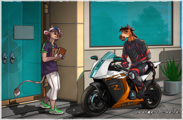 Commission for featuring their characters, Leonidas and Alisha. Seems a simple offer of a ride might lead to a lovely relationship... What can you say? Lions in leather on bikes. What's not to like? XDLeonidas and Alisha belong to