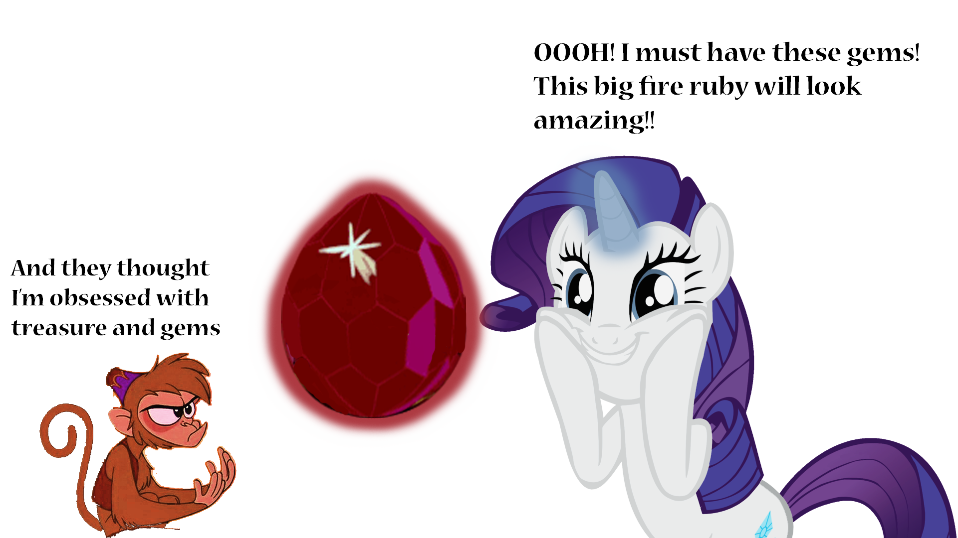 lol This is funny. Especially how Abu is just like "really?". To be fair though, Rarity uses gems and whatnot for her designs. Abu just likes shiny things.