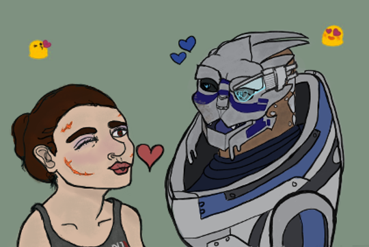 Finally drawing something shakarian! This was meant for Beginner Art Friday, but I kept getting delayed. So now it’s getting posted on Monday! I used a shot from the cute little headbutt scene as a reference. As much as I love Garrus, he is so damn hard to draw.