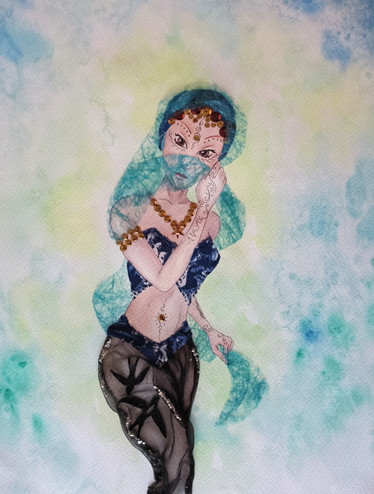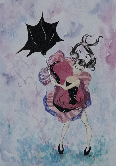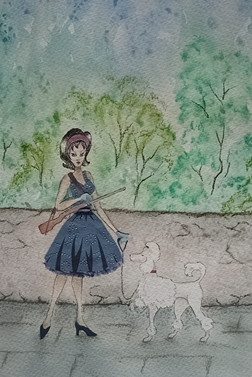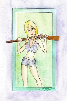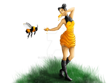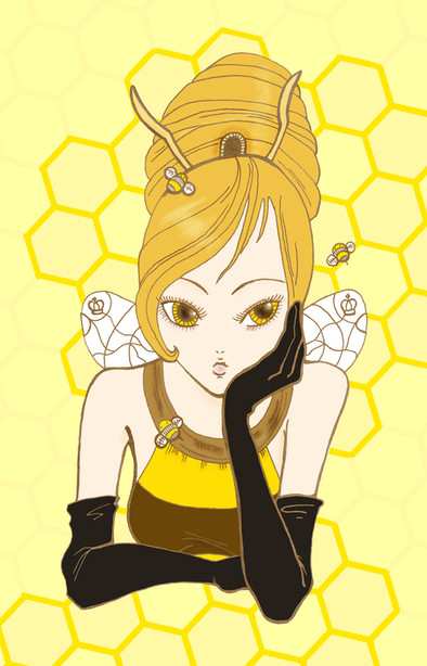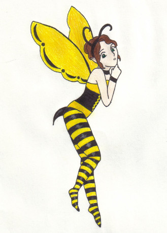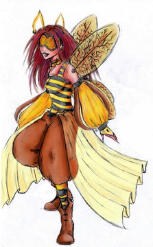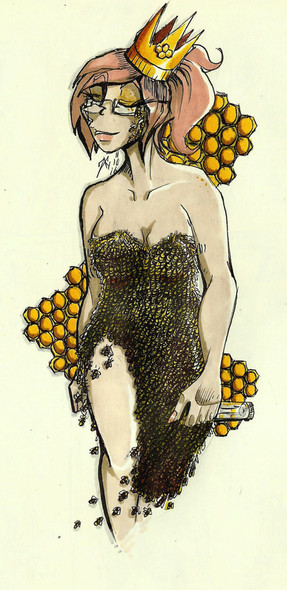 I love this. Her tightfitting dress design is dazzling. I like the torn pantyhose (?). Also, I like how you drew the wings, there but almost invisible except for subtle lines. The hat is also a nice touch. I also like the honeycombs and fat little bumblebees that don't look like they'd even sting an intruder!