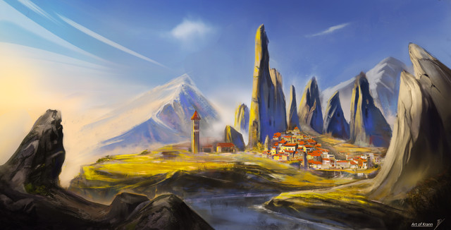 #2d #heaven #spring #cityscape #conceptart #digitalart #flowersandplants #greengrass #rockymountains #violet #water #gameartconcept