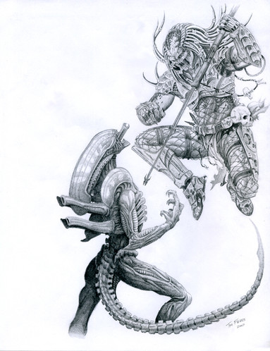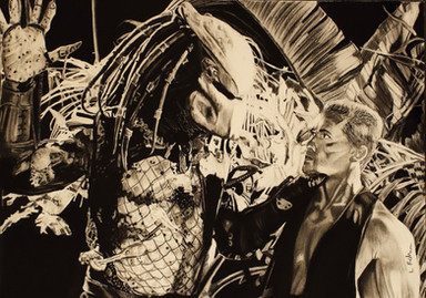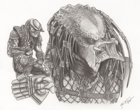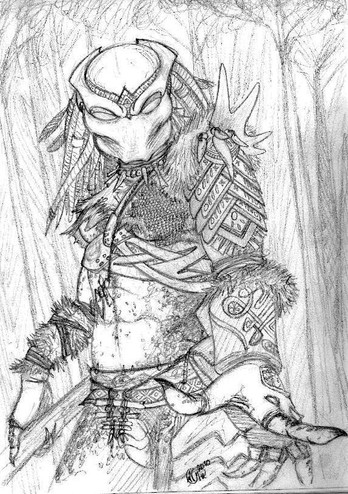 I drew a human! I drew Arnold! Or more precisely Arnolds character "Dutch" in the first Predator movie.I wanted to draw the scene when the predator lifts Arnold up against the tree and scans him. So I started tracing out the bio for him but it did not look right. This was frustrating, so I erased it... and I took the decision to draw the predator without his bio on. Still the same pose and all, but without his helmet.