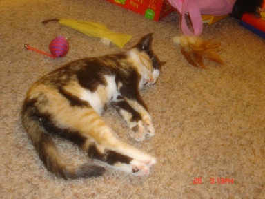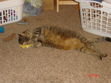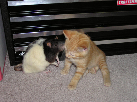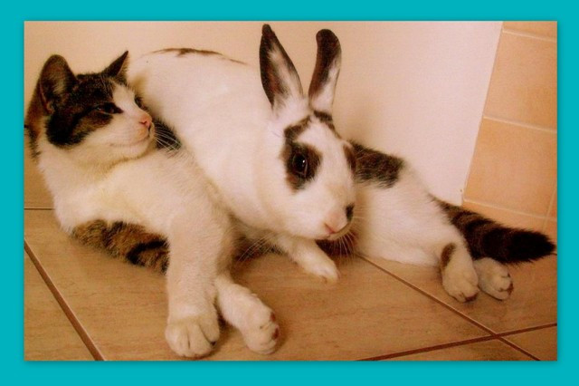 Aww ain't that cute. The baby Dutch Bunny and the Jake the cat are laying together.This was taken in my sister's room where she laid them down next to each other.