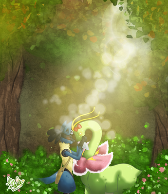 "Lucario blushed bright red, “You really mean that, Bayleef?” Bayleef nodded and blushed, “Of course I do.” Once again, Lucario held up Bayleef’s paw with his own, as he looked into her eyes. “Bayleef…” He asked her, “Will you… Stay here… With me… And be my destined Aura… For life…?” Bayleef smiled as brightly as she could, “Yes, Lucario… I will…”"