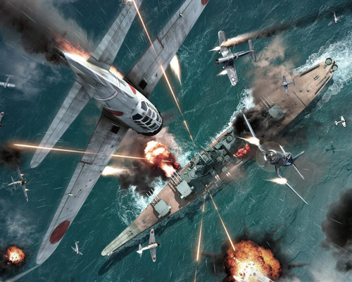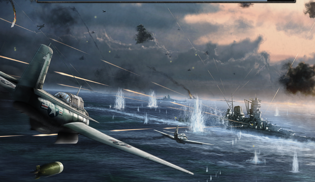 first focus point肯定是近景交战的飞机了,我觉得扔下的鱼雷可以作为非常吸引人的second focus point,那么鱼雷就需要更清晰的轮廓或者一点反光之类的细节来抓住观众眼球