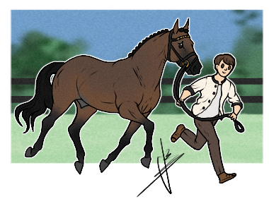 Ha ha, this picture is so funny. Benji's expression looks so tricky, and it's so realistic how you drew his halter getting pulled of to one side. Benji's anatomy looks great, and so does Cameron's! You are so lucky you can draw good humans.