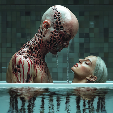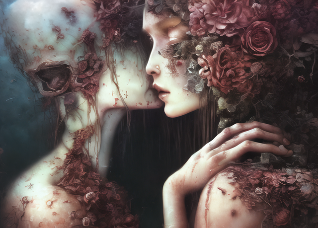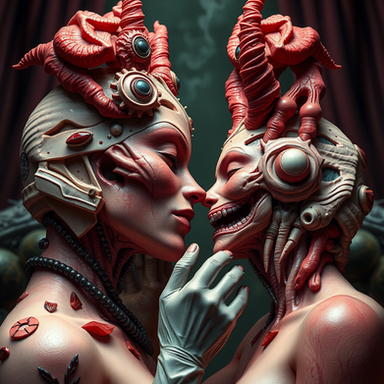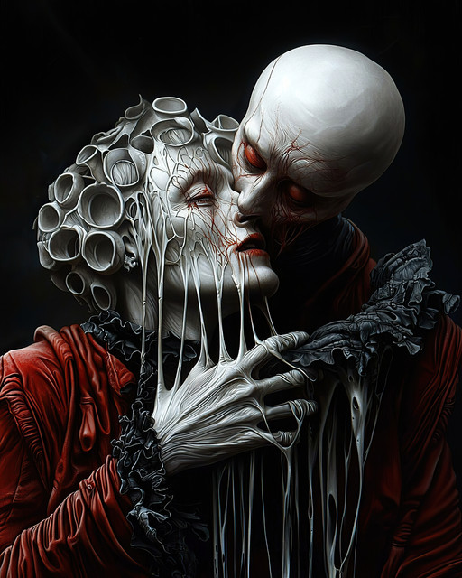 #horror #digitalart #monster #ai #bizarre #digitalwork #kiss #kissing #prompt #sensual #sensuality #bizarrecreature #coprinuscomatus #generativeart #aiart #aiartcommunity #midjourney #midjourneyart #midjourneycommunity #synthography #midjourneywork