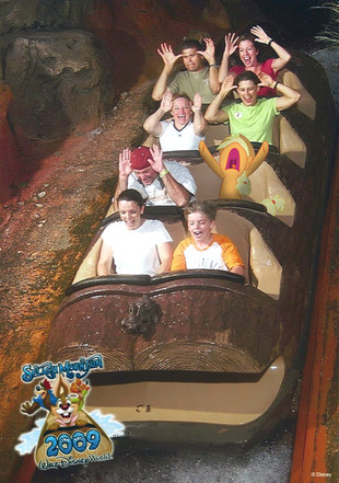 I love this pic! Here I am with the guys on Splash Mountain, which is my all time favorite Disney ride.The two guys in the front are Carlos (the one who looks asleep) and Mike (Mr. Tuff-stuff looks kinda scared, he he he). Behind them is Josh, and behind that is me and Tommy. In the very last row is Hank (doing the "Sa-pose" from Angelic Layer... lol, leave it to hank to do an anime pose on Splash Mountain.)