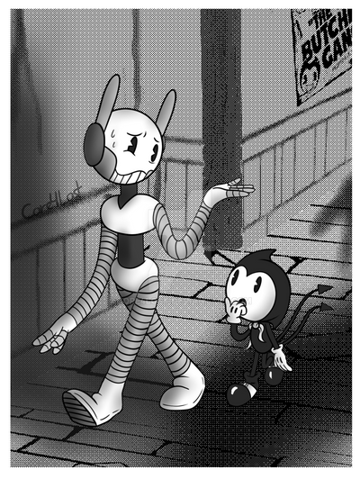 this is a AU of Soul-Bendy where I kinda made a weird and crazy idea of a drawing of Henry getting possessed by Lanky while Corr (AKA) Henry's nephew was trying to find a way to get Lanky out of his uncle's body from using " the Illusion of Living" since he took the book when Bendy and Henry wasnt looking. the reason Corr got turned into a Toon was that Corr went with Henry and Bendy to the studio to meet with Boris since the whole disaster of the studio was over from the past 2 years ago. but ever since Corr was slowly trying to get used to Bendy, everything went down hill as Corr got infected by the ink and well....here he is...toonified. but anyway, Lanky has interested in Corr since he didnt want to be alone in the studio plus the ink Corr got infected with...was in fact Lanky's ink. so Corr is part of Lanky, so Lanky is after Corr so he wont be so lonely, but Corr...he has a hard time returning those feeling if Lanky if Lanky doesnt try to hurt the people Corr cares about around him.Soul-Henry, Lanky: By DemonSheyd500025