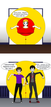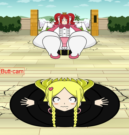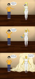 Alice wants to use the gun to flatten Olga, but will she manage to do it ? Of course not : she's Alice, and she's Olga.This is an art trade with RolyHolyBoly , here's his part