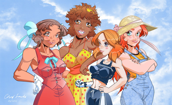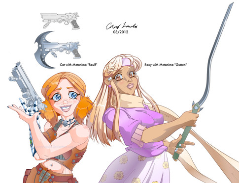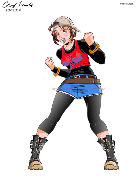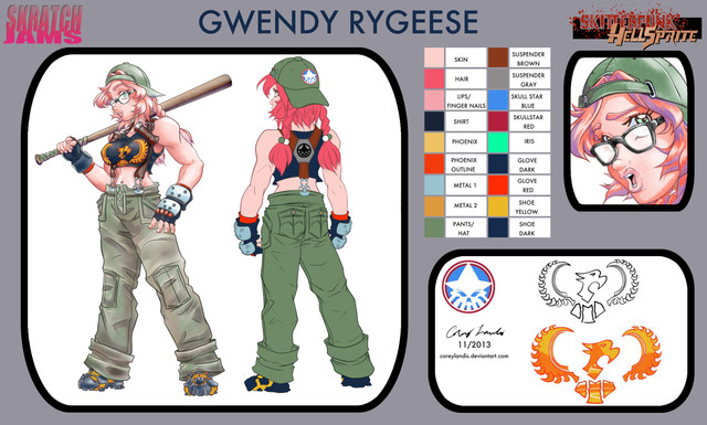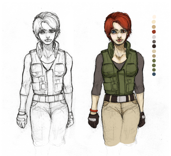 EDIT: Modified the kneepads and color corrected them. Redid the camouflage on the pants. Added texture overlay to the one on your far right. I'd forgotten that I'd purposely made the skin tone a bit darker than normal before forgetting to add a texture overlay, before. Redid the shading and some of the highlights on the shirt for SLIGHTLY more realistic boob physics.Reworked my OC, Cat, a bit. Didn't exactly reinvent the wheel this time, but there are a some simplifications. Finally managed to draw her as short as I always said she was. Widened her out in spots to try to make her look a bit tougher, despite shortness. Making a choice to almost always cover the midriff because that's just immature AND Gwen's job. I'll design some kind of jacket to go with this when I find the time. Aside from this picture, the only thing I've found time to draw in the last week where some simplified redesigns of Cat's prosthetic forearm. Things need to slow down.