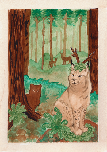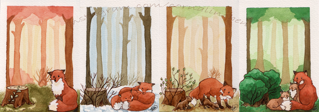 There are only a few things I would like to note: Maybe wash a greenish base that's fairly light over the back before doing anything so that when you color in everything else, the white spaces are not so obvious. This is strictly a suggestion. The white outline of the fox has its own effect, and it is worth keeping, if your intuition so asks.