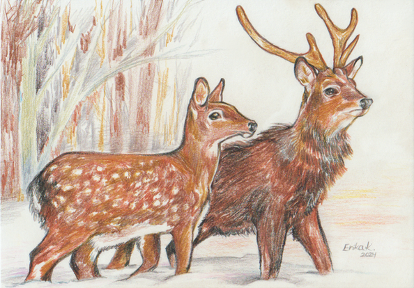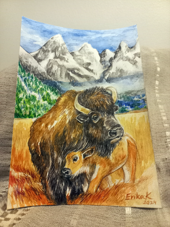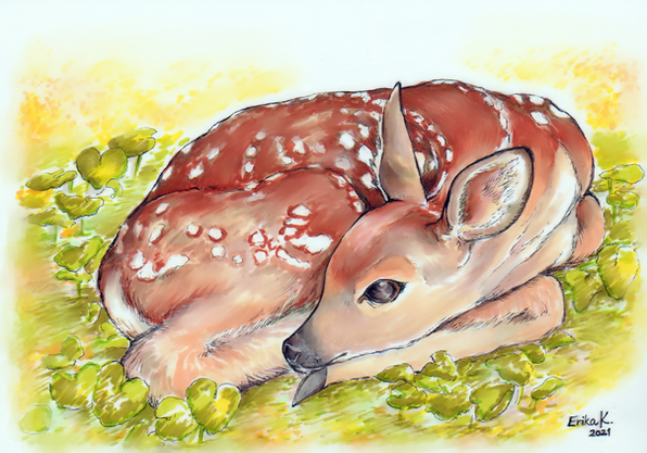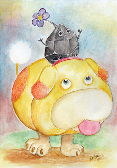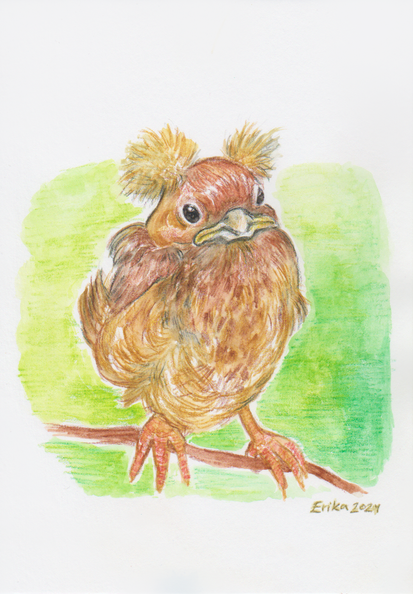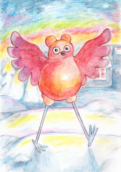I wanted to draw him something extremely adorable this time, so I painted a capercaillie female with a couple of chicks. I actually used a nature photo as a reference to this and painted with watercolors and watersoluble ink pencils.