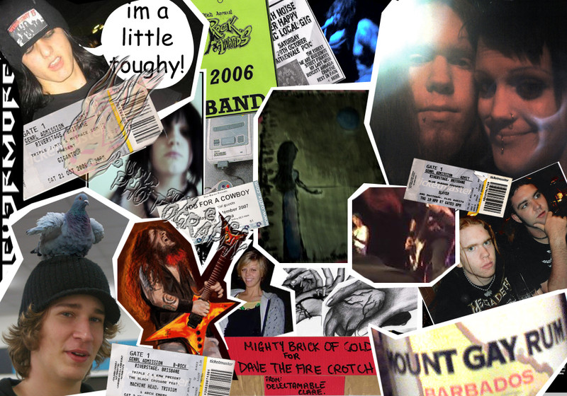 this is basically just a collage of good memories... or things that are important to me... the guy in the murderdolls shirt is my mate kris, weve been mates for about 2 and a half years now or something. he's always good to get pissed with, i decided to ue a shitty photo of him when he was 15... as opposed to him now four years layer hahahathe guy with the pigeon is mikael, ive been mates with him since grade 9... he has a pigeon on his head...