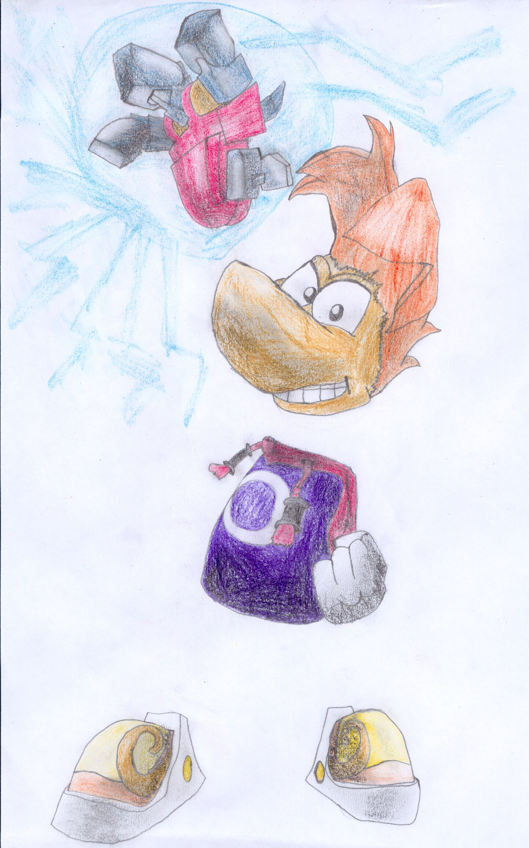 Rayman is a coll character, like your drawing of him. His robot glove is great.