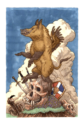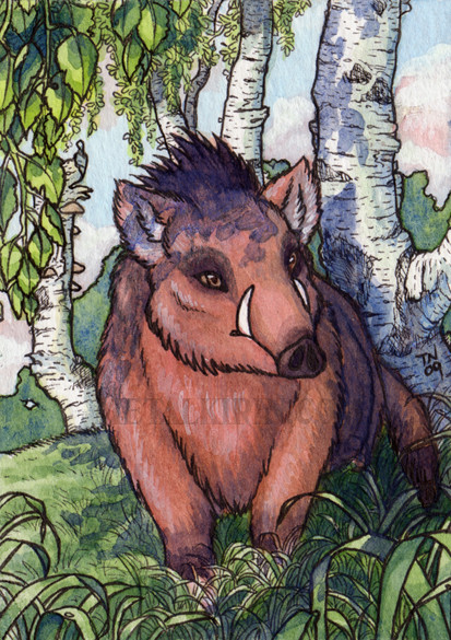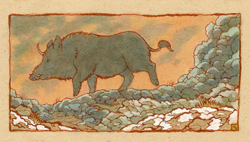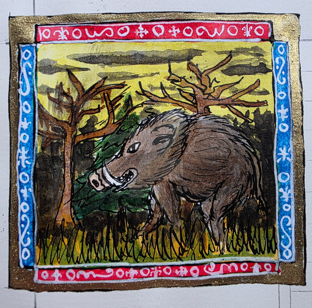 The other day I bound several old pads of paper into sketchbooks using a tutorial - Originally I was going to cover them with stickers as per the usual sketchbook process, but this material* was so tempting I decided to draw on this one instead! It's all posca paint markers and is almost entirely metallic gold color, except for the lines, vines, and the boar. It looks SUPER cool IRL! I'm really happy with it. It reminds me of a woodcut or something but like, super shiny. The boar itself also turned out super cute C: