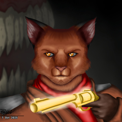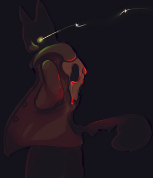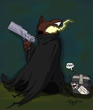 I think you did a particularly good job here; the shading style is solid and flows just right (especially the glow on the shoulder from Schro's eye). I think what sets it off are the softness of the lines in Schro and then the contrast of the deep, bursting black in his cloak. I would recommend perhaps some stronger ink lines, but other than that, your experimentation is creating some impressive results.