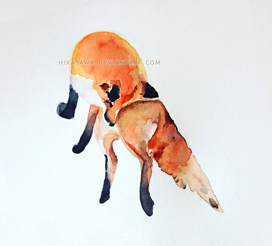 maybe add a small line in the far background as a ground? Not under the fox, but on the horizon? like a plain maybe?? --so the fox doesn't look like he's jumping from the sky/looks like he's floating? this might also help the crow look smaller than the fox. other than that, it's really pretty!