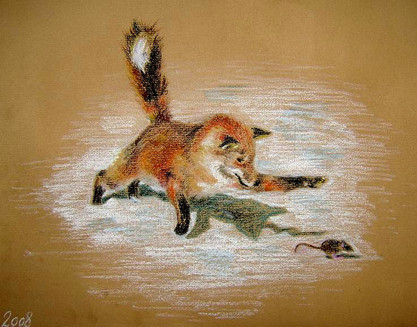 Nice. I really like the twig in the crow's beak. The crow looks like hes looking in the direction the fox jumped from thinking 'I heard a noise from over there...'. It looks finished, but to me the angle of the fox's paws make it look like he might miss the crow.