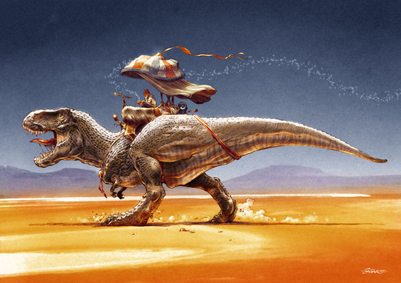 Wow. This is absolutely beautiful! Hah hah I really love dinosaurs and any sort of related creature! And wow, the detail on this guy (and the entire picture, itself) is amazing! I really love the lurking look of the rock lizard and the suspicious look of his rider.