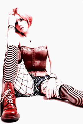 Lovely colors and pose. She's all scrunched up, but her breasts are just there offering themselves. I like her punky attitude, it's a contrast to the shy, coy pose she's taken. I think the red of her hair fading to black tips is a great match to the red top fading to the black boots. She's gorgeous and powerful, but womanly and demure at the same time.