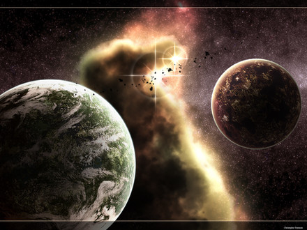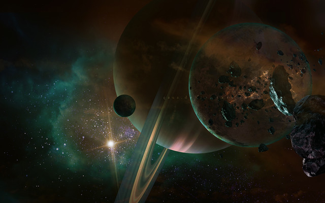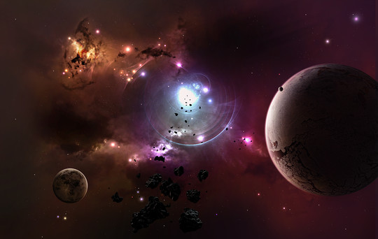 In my tiredness I went to save the web-sized version of this, and in the process, ended up deleting the full resolution from photoshop's limited history (I have a version with the nebulae, but not with a tightened starfield nor any planets). Somewhat frustrating, so there's very little room to make wallpapers out of a flipped version. Similarly, no larger resolution prints will be available, though if anyone actually wants one I just may be able to recreate the finalised starfield/planets to make one available. Well, enjoy, I quite like the result - even more frustration for the loss of the high resolution - but at least the image has survived to be seen.
