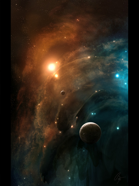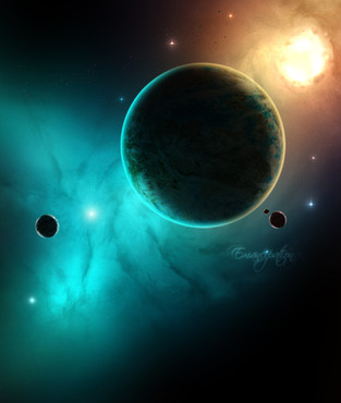 Love the space, but the planet's neon brightness doesn't seem to fit with the more realistic muted colours of the background. Plus whilst your composition is getting there (the focal planet is on the third, I see ) the placement of the other two planets doesn't really balance out the image, and it feels like there's something missing in the foreground on the left side of the image - and the nebula doesn't work because it's very suitably hapdash, as it ought to be. Plus, whilst the top image gives off the impression that it's well framed, because of the placement of the elements, the way the large planet is half in the image and half out exacerbates the bottom's formless style. I sincerely doubt you're planning to change anything in the image, and it's a wonderful technical execution, but there's a couple of artistic niggles I have with the work that prevent this from becoming incredible in my mind.