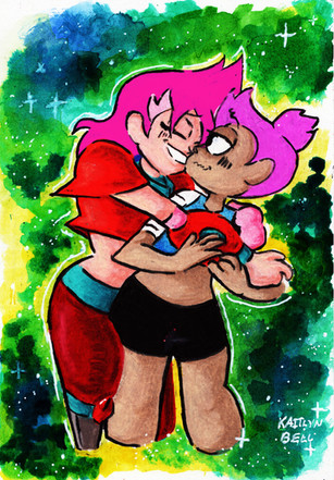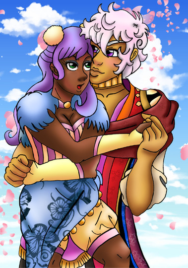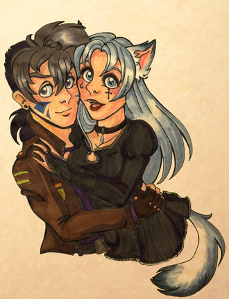 A pencil and markers portrait of GreySparkle 's characters Rix and Ruh.