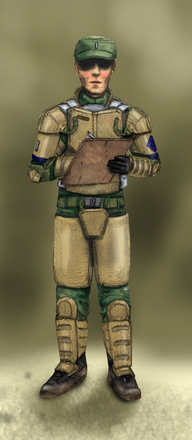 The face plate on Earth Union helmets can be removed for easier breathing and ventilation. Regulations on when the face plate had to be worn varied unit by unit.Also worth noting in this piece is the rifle, which is a STORM 2 A2. The most obvious difference between this and other STORM models is the iron sight attached to the gas block, an item which most STORM rifles lacked.