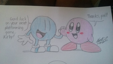 Couldn't think of a better title.Remember those character expressions I did last week that featured Barry being angry because he kept being called "Blue Alternative Pac-Man"? Well, here we see him with Pac-Man, and he is NOT in a very good mood. Of course, as the retard he is, Pac-Man has no idea what he's so angry about. Barry isn't the first one to get angry about being mistaken as Pac-Man, though. His half-brother had been endlessly called "Pac-Man" ever since he graduated from military school, and it drove him so bonkers, he had to ease his pain by shooting himself. Yes, I just clarified something very disturbing. Ya wanna be a baby about it? Then go on ahead.