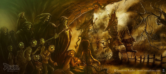 This is super nice!~ One thing I noticed though, and I'm just curious. I see that the humans have shadows that fall upon the ground, but the witch creatures don't. Was this intentional? '3' I can see it going either way, like you might be using a bit of lore with vampires and how they might not have reflections or shadows.