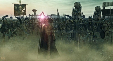 Initially I did want her standing on a hill commanding her army... but she would have too far away for us to see her face.