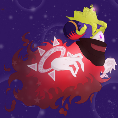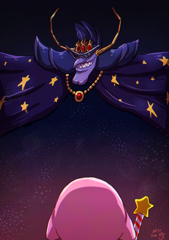 Long overdue piece for Funny-Replay... who is no longer active on this website. I've come to terms with the awful person that I am. I wanted to give up on this piece many times during the drawing process; honestly, I should have dropped the project - art shouldn't have to burn in hell with the artist. And yet, it's done. I kept going because I just wanted to see something good turn up from a failed piece, even if it is never seen by the person it was intended for.The request was to draw the scene in the final episode of Hoshi no Kaabii where Kirby defeats Nightmare. Out of context, it looks like Nightmare is losing his mind over his necklace shattering. All-powerful space wizard loves his jewelry. ;^)