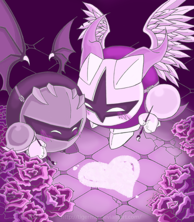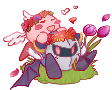 Jiggs thinks Meta Knight needs more flowers. <3I have a new take on this couple that I’m starting to like. I imagine Meta Knight as highly egotistical as he is chivalrous and actually prefers to be with a helpless "maiden" who he can fend for, plus someone who won't pry too much into his past. I imagine Jigglypuff doesn't talk at all (like most Pokemon), but her general cheeriness helps Meta Knight heal from some of his darker memories.