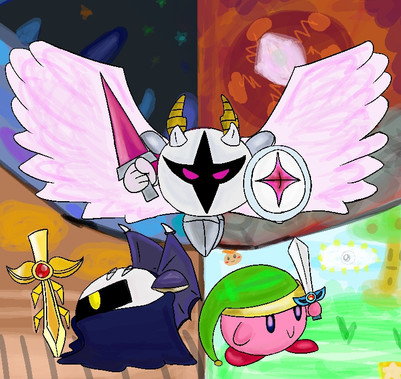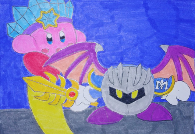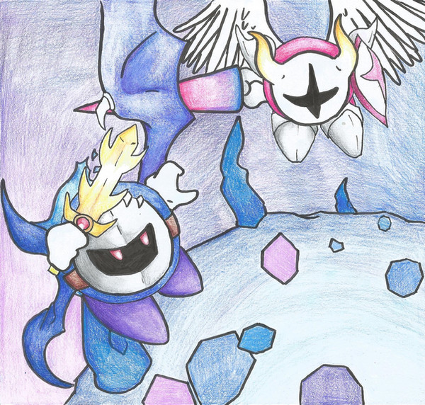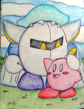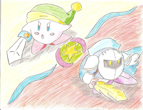Artwork for Medieval Knight's Tale on Fanfiction. Sorry about the cheap scanner I used. Made with colored pencils and a black felt-tip pen.Meta Knight belongs to Nintendo and HAL. Clara belongs to me.
